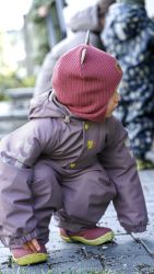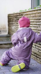 Kattnakken flyverdragt Slaps i farven Blåbærmælk har en blød, støvet lilla tone, der giver et sødt og vinterligt udtryk. Den sarte nuance gør dragten nem at kombinere med andre farver – både til mønstrede huer og farverige vanter.