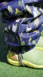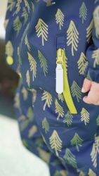 Kattnakken flyverdragt Slaps i farven Marine er en del af serien Tolvmeterskoven og prydes af et flot print med stiliserede grantræer. Den dybe marineblå nuance giver et klassisk og tidløst look, mens det naturinspirerede mønster tilfører et legende og eventyrligt udtryk, der passer perfekt til vinterens oplevelser ude i sne og sjap