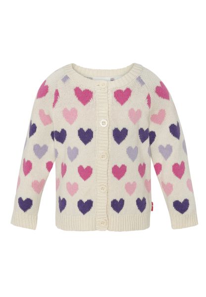 Den fine råhvide farve med små hjerter i rosa og lilla giver et klassisk og feminint udtryk, som passer til mange forskellige outfits. Cardiganen lukkes med knapper foran, hvilket gør den nem at tage af og på.